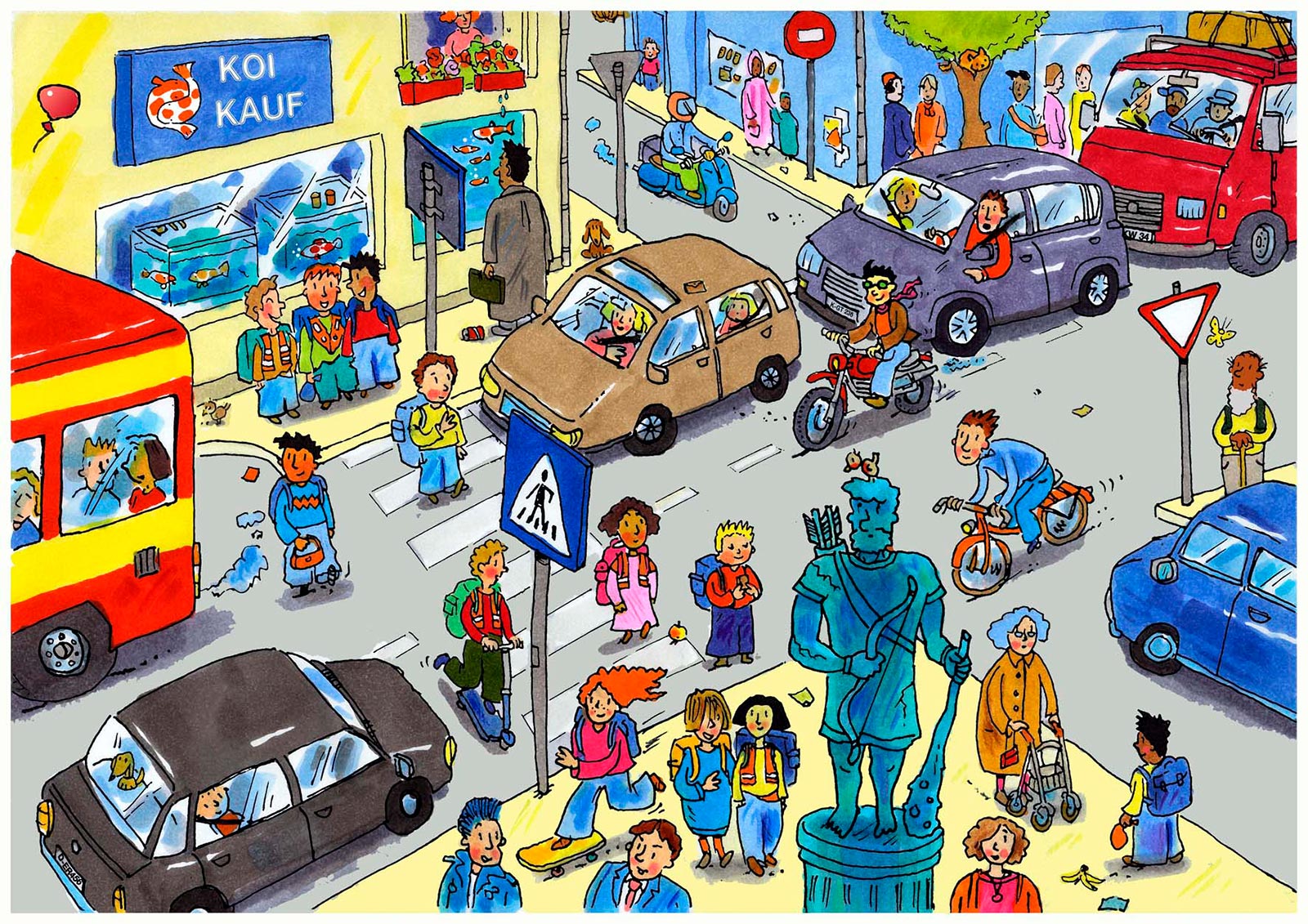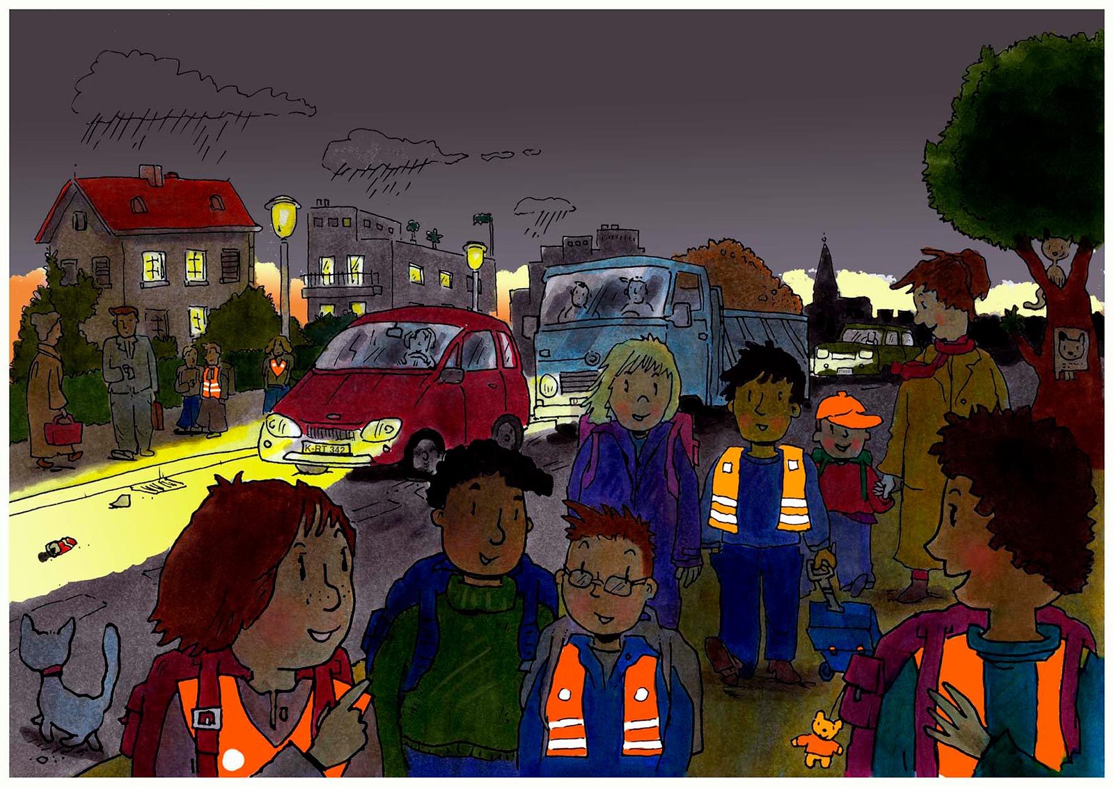 Illustrationen für Arbeitsmaterialien im Grundschulbereich zum Thema: "Verkehrssicherheit" für den Verkehrsverbund Rhein-Sieg